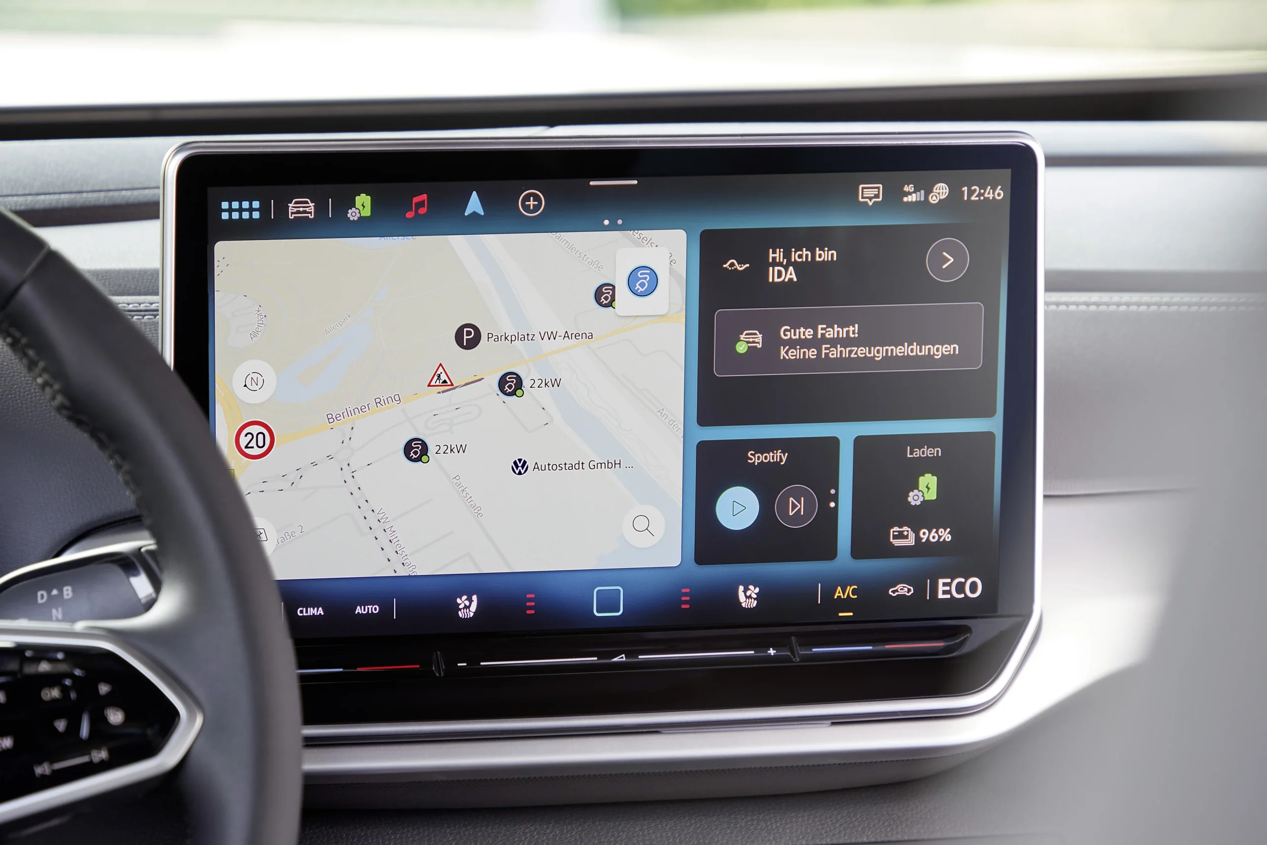 Kur hyni në brendësi të ID.4, përjetoni një ambient që bashkon teknologjinë moderne me rehati të jashtëzakonshme. Me një kabinë të ndritshme dhe materiale të cilësisë së lartë, ID.4 është i projektuar për t’ju ofruar një përvojë luksoze gjatë çdo udhëtimi. Ekrani i madh i prekjes me sistemin infotainment intuitiv është në qendër të komandave, duke ofruar lehtësi dhe mundësi të shumta për të kontrolluar funksionet e veturës. Sistemi i klimës “Air Care Climatronic” mundëson kontrollin automatik të temperaturës në katër zona të ndryshme, duke ofruar një ndjenjë rehatie për të gjithë pasagjerët. Uleset ergonomike të mbështjella me materialet më të mira dhe mundësitë e rregullimit në disa drejtime sigurojnë mbështetje dhe rehati gjatë udhëtimeve të gjata. Gjithashtu, tavani panoramik krijon një atmosferë të hapur dhe ndihmon që hapësira të duket akoma më e gjerë dhe më e ndritshme.