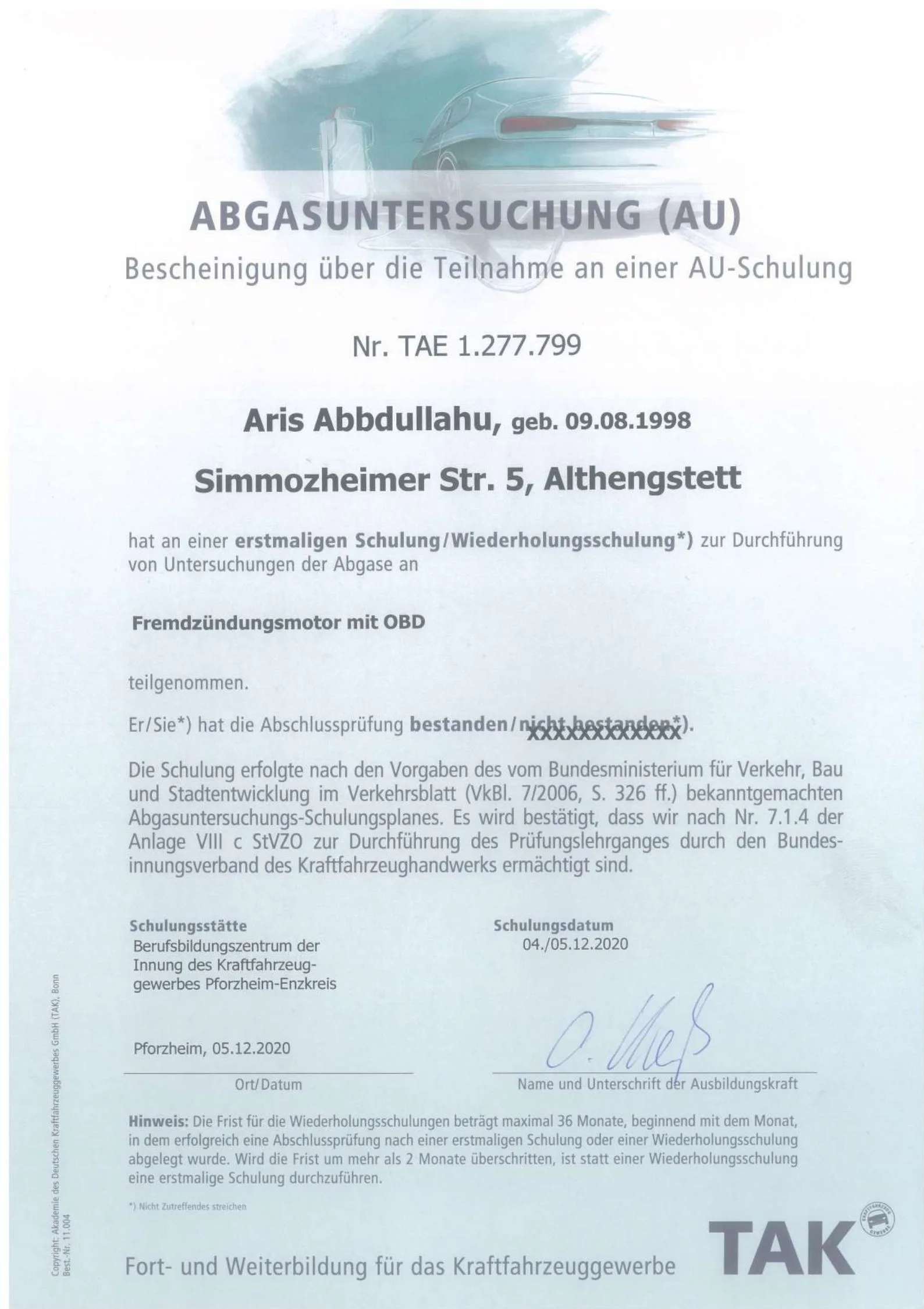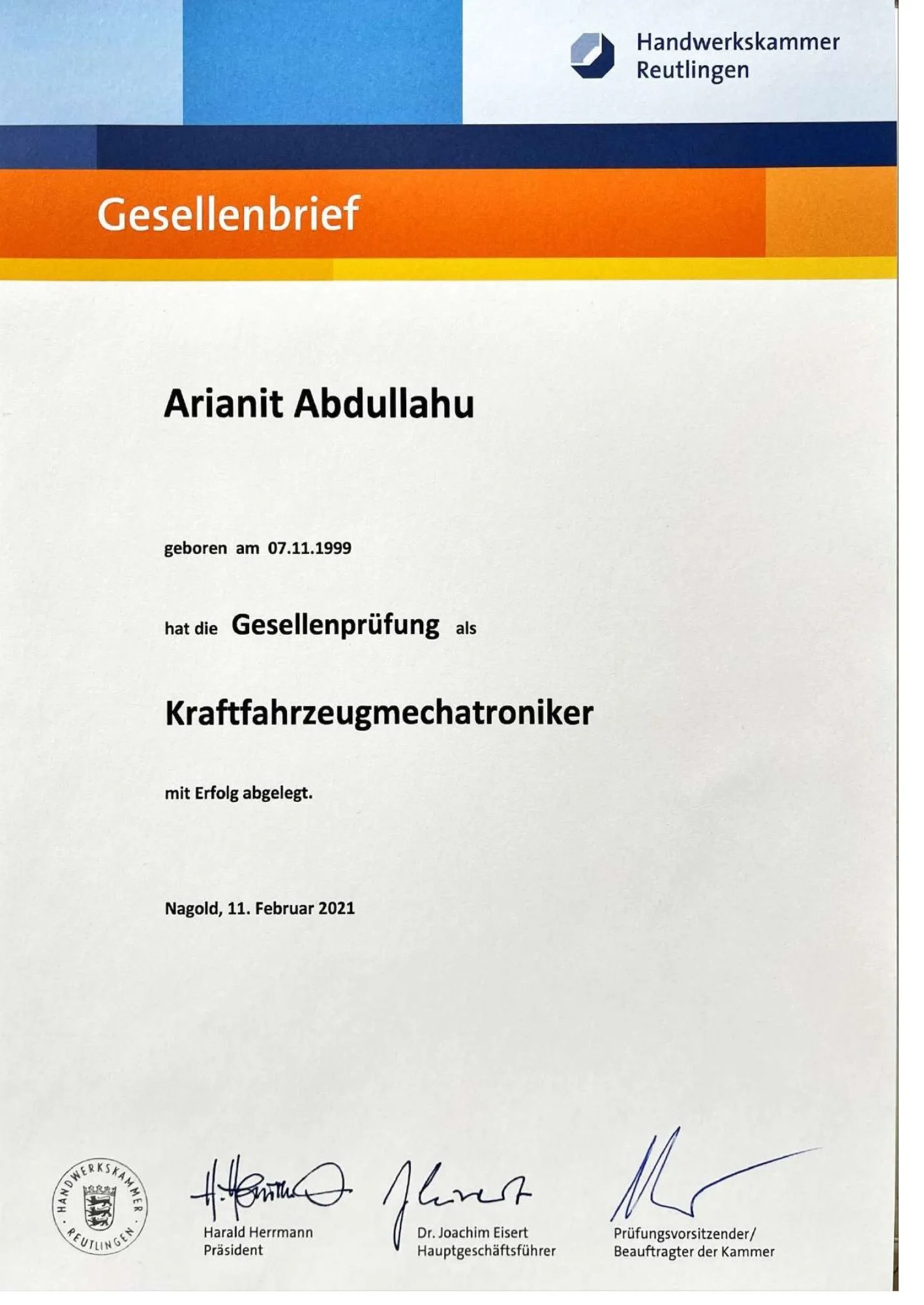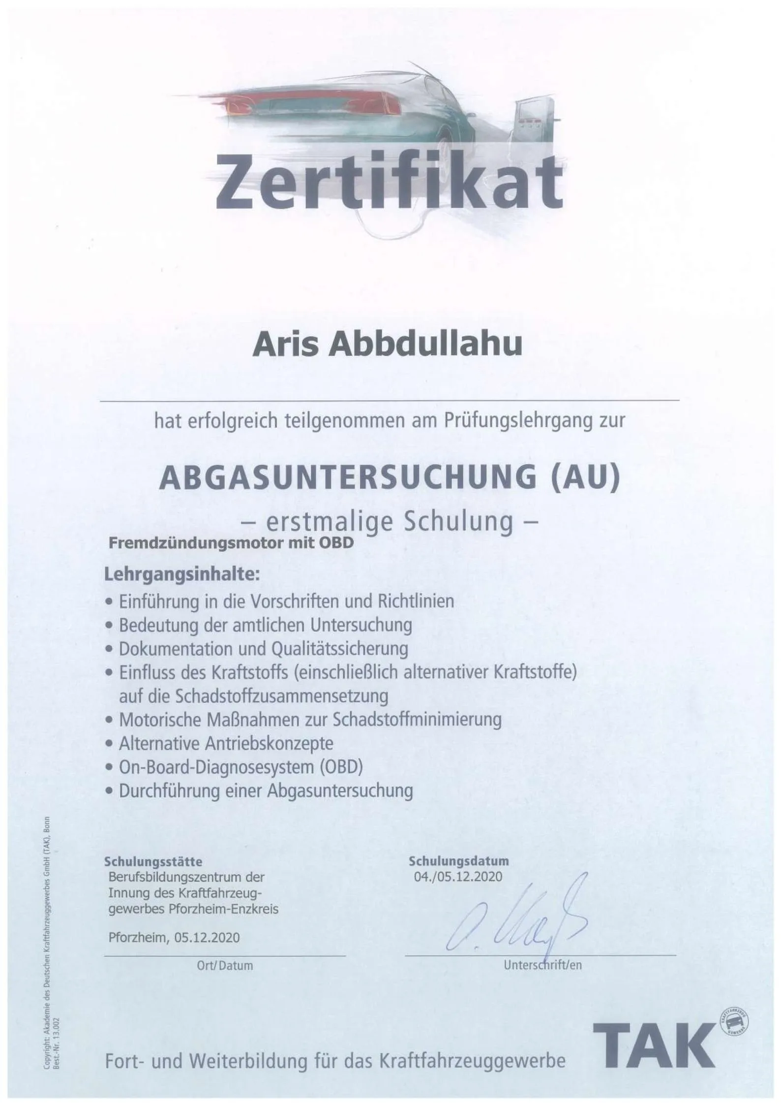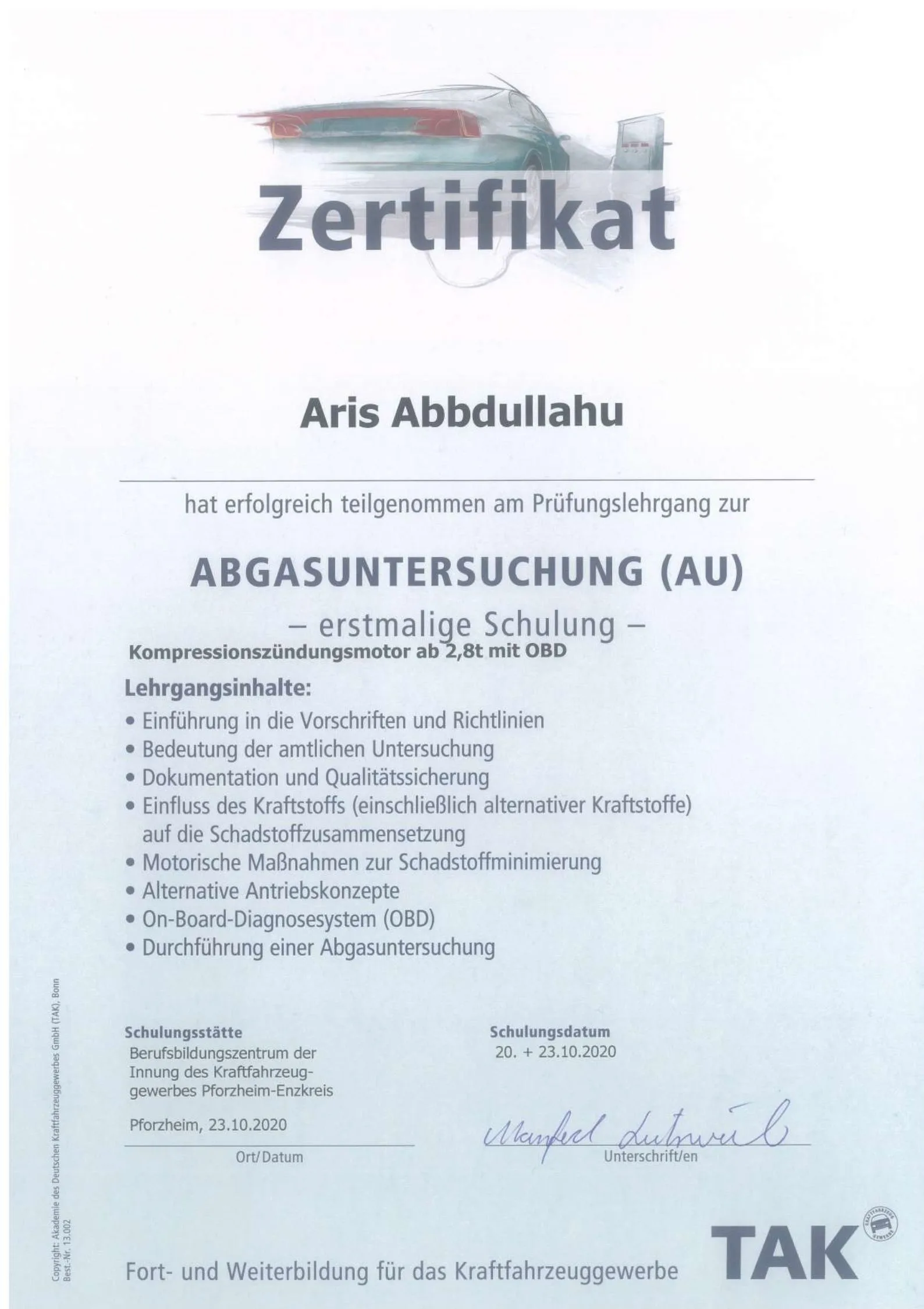 Me rritjen e kërkesave së veturave elektrike, Baki Automobile është krenar të jetë i vetmi në Kosovë i çertifikuar nga Volkswagen Bildungsinstitut Zwickau i Gjermanisë për automjetet elektrike, hibride elektronike dhe mekanike për markat Volkswagen, Audi, Škoda, SEAT dhe Volkswagen Komerciale, duke na pozicionuar si lider në këtë fushë.
